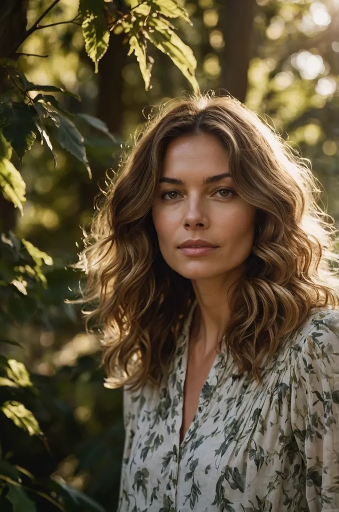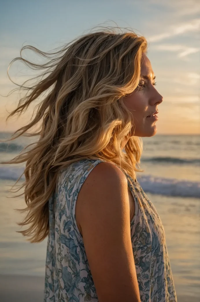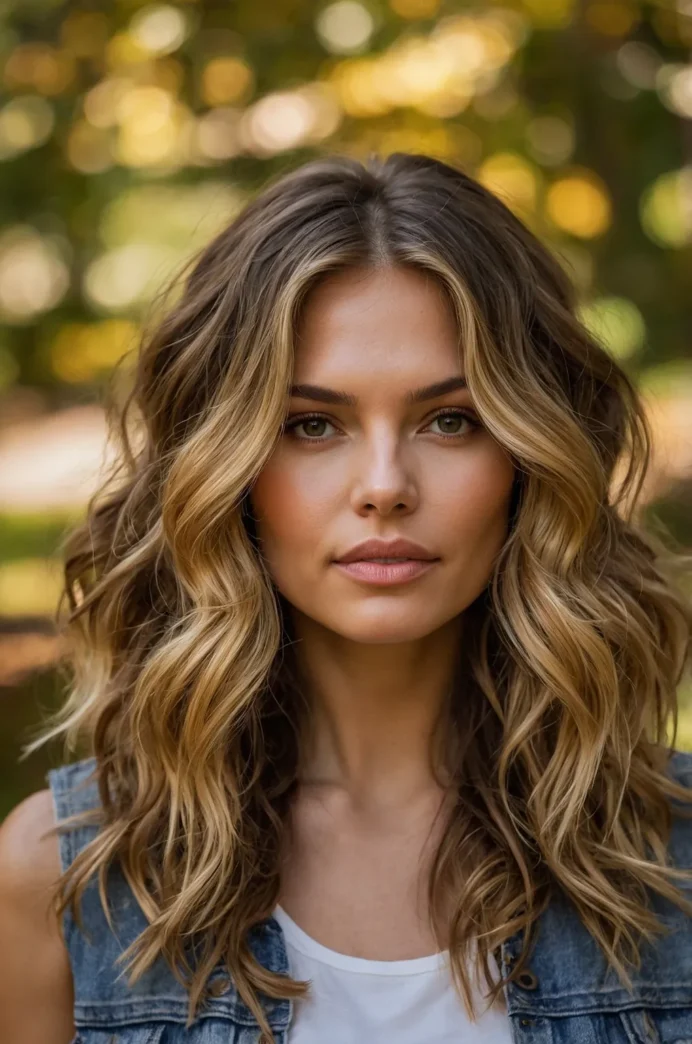 This hairstyle features medium-length waves with a soft golden balayage. The layers start at the chin, adding volume and texture, while the golden tones enhance the dimensionality of the cut. This is the perfect look for someone wanting a subtle yet stylish transformation.