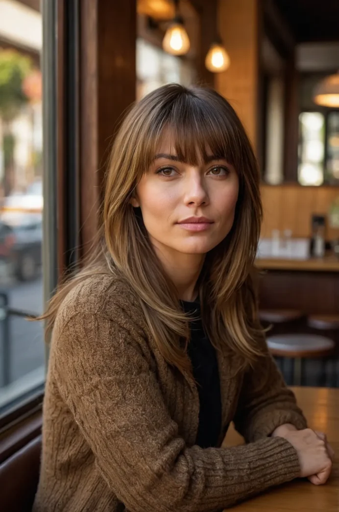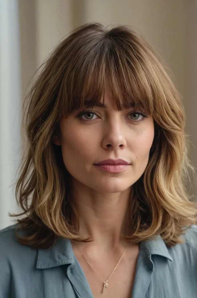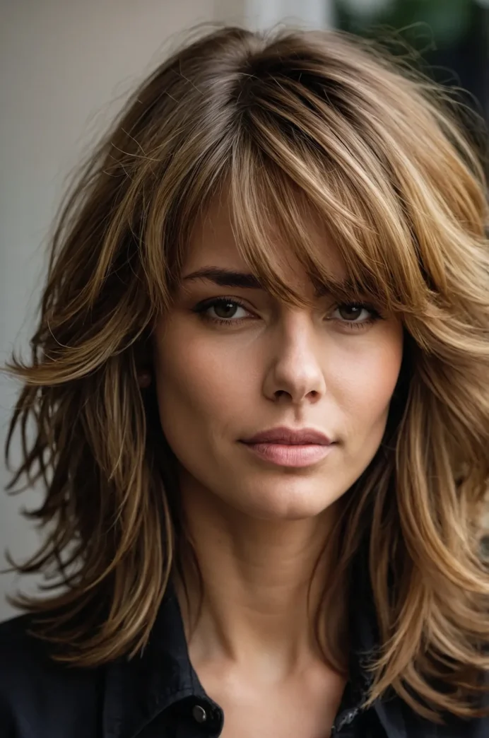 This hairstyle includes soft, feathered layers paired with wispy bangs. The medium length adds body and texture, making it ideal for those looking for a chic, casual look.
