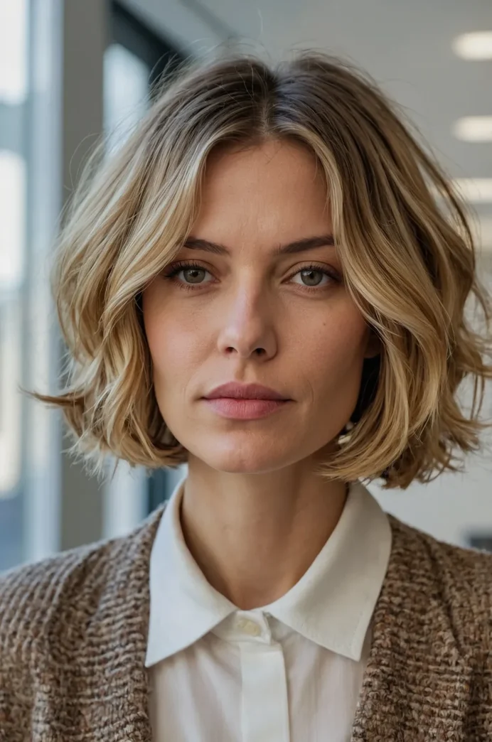 The layered bob with subtle waves offers a timeless, chic style. This cut is ideal for anyone wanting a more structured, easy-to-maintain hairstyle that still has movement.